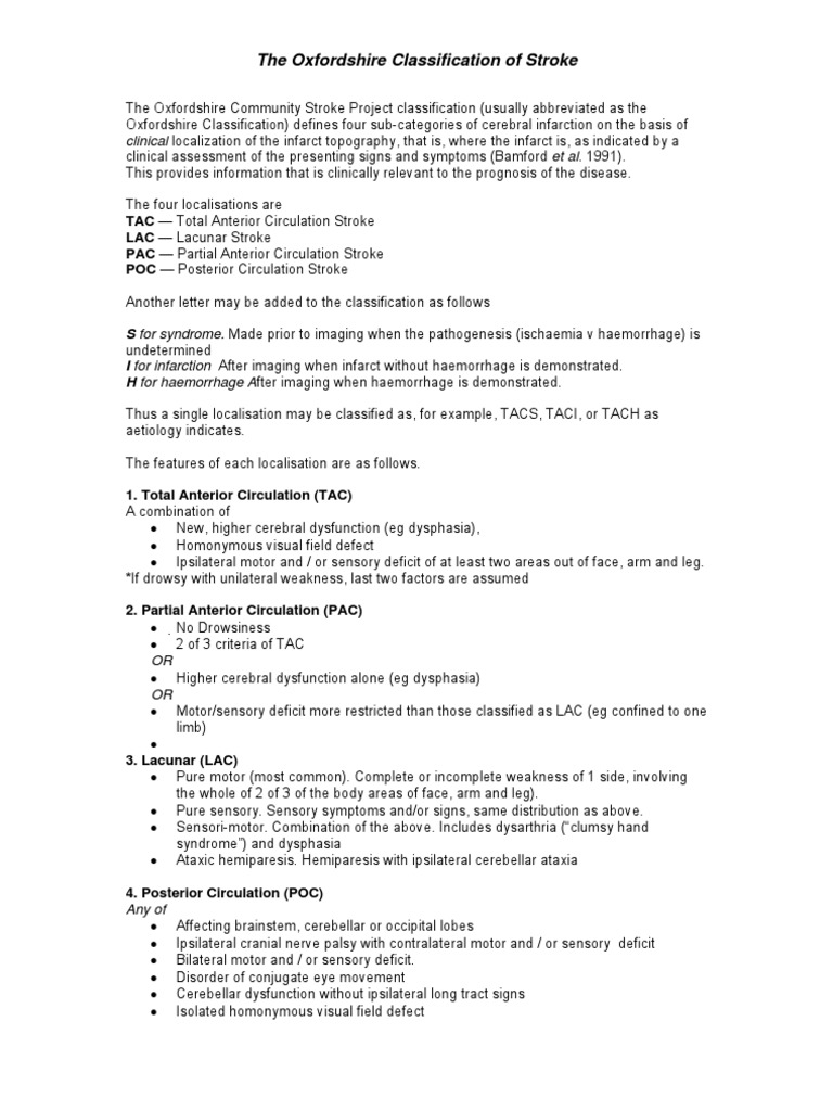Stroke Medicine For Stroke Physicians And Neurologists . The Most Commonly Used Classification System For Ischaemic Stroke Is The Bamford Classification System (Also Known As The Oxford Classification System).